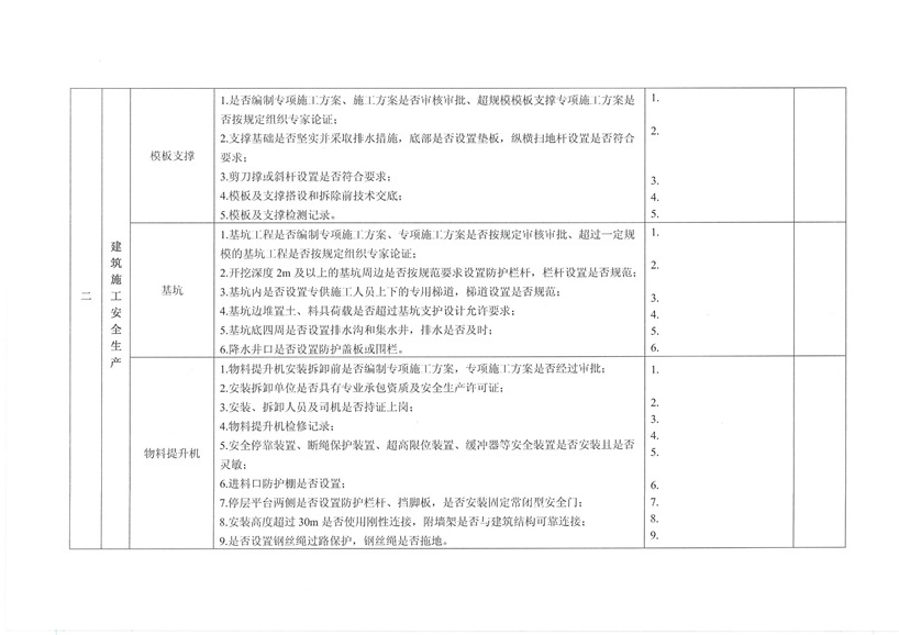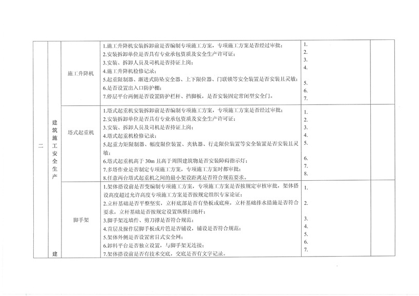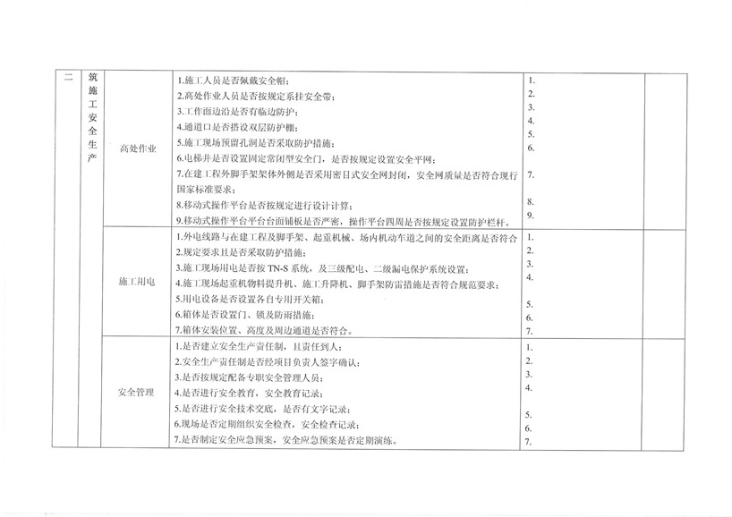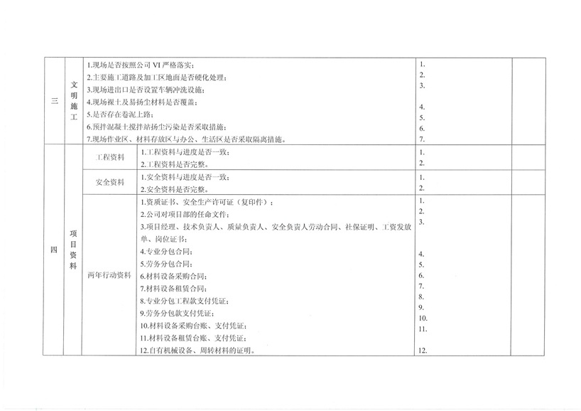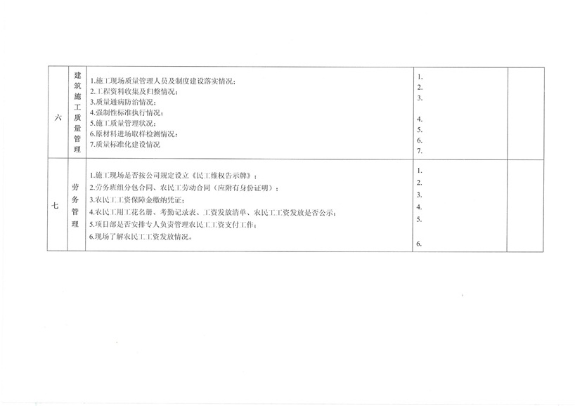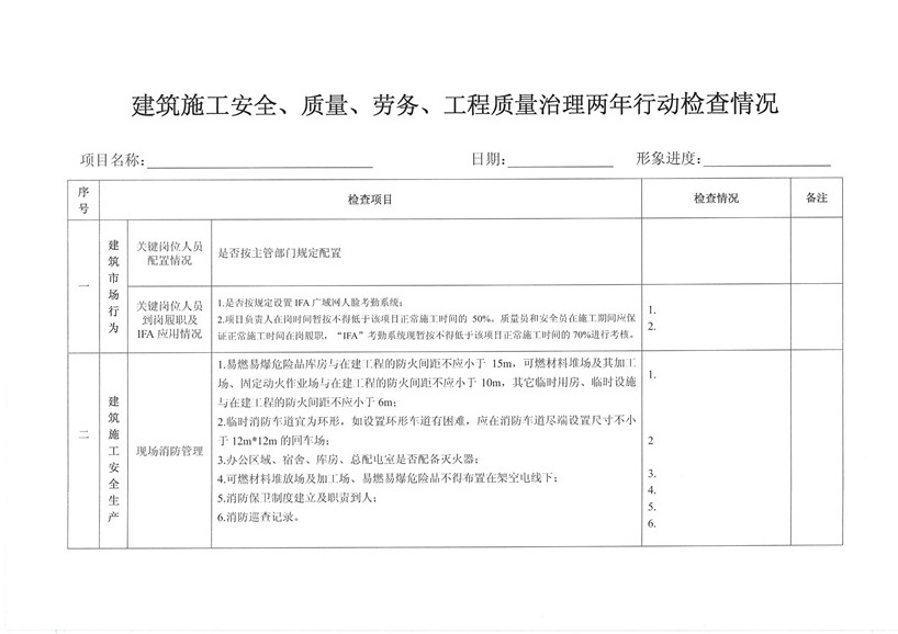 集團公司各部室、分公司、項目部: 為繼續(xù)深入開展工程質(zhì)量治理兩年行動,進一步加強工程安全、質(zhì)量規(guī)范管理,保障廣大農(nóng)民工合法權(quán)益,促進項目工程穩(wěn)固進展。公司決定對各在建工程開展秋季安全、質(zhì)量、勞務(wù)及工程質(zhì)量治理“兩年行動”綜合大檢查,現(xiàn)將相關(guān)事宜通知如下: 一、檢查時間安排 2015年10月30日—2015年11月10日 二、檢查組成員 組 長:張濤 副組長:王健 組 員:胡巨偉(負責(zé)兩年行動、市場檢查,周文淵配合) 陳治明(負責(zé)勞務(wù)管理,肖家駿配合) 張亞偉(負責(zé)安全生產(chǎn)管理,李芬芬、藺濤配合) 王 軍(負責(zé)質(zhì)量管理,王坤海配合) 三、檢查內(nèi)容 1、安全生產(chǎn) (1)項目部安全生產(chǎn)管理制度、廣域網(wǎng)IFA考勤工作及安全管理人員落實情況; (2)深基坑、高支撐、高處作業(yè)等危險性較大的分項工程方案編制、審批、專家論證及施工防護情況; (3)塔吊、施工升降機全過程安全監(jiān)控落實和備案、檢測;施工機械設(shè)備維修、保養(yǎng)臺賬落實情況; (4)腳手架、臨邊洞口防護、臨時用電布置情況; (5)文明施工、揚塵防治、企業(yè)形象建設(shè)情況; (6)特種作業(yè)人員持證上崗、農(nóng)民工學(xué)校及工人安全教育落實情況; (7)安全資料同步整理情況。 2、質(zhì)量管理 (1)施工現(xiàn)場質(zhì)量管理人員及制度建設(shè)落實情況; (2)工程資料收集及歸整情況; (3)質(zhì)量通病防治情況; (4)強制性標準執(zhí)行情況; (5)現(xiàn)行節(jié)能標準執(zhí)行及施工質(zhì)量管理狀況; (6)原材料進場取樣檢測及質(zhì)量標準化建設(shè)執(zhí)行情況。 3、勞務(wù)管理 (1)施工現(xiàn)場是否按公司規(guī)定設(shè)立《民工維權(quán)告示牌》; (2)勞務(wù)班組分包合同、農(nóng)民工勞動合同(應(yīng)附有身份證明); (3)農(nóng)民工工資保障金繳納憑證; (4)農(nóng)民工用工花名冊、考勤記錄表、工資發(fā)放清單、農(nóng)民工工資發(fā)放是否公示; (5)項目部是否安排專人負責(zé)管理農(nóng)民工工資支付工作; (6)現(xiàn)場了解農(nóng)民工工資發(fā)放情況。 4、工程質(zhì)量治理兩年行動 (1)施工現(xiàn)場是否設(shè)立專人負責(zé)工程質(zhì)量治理兩年行動; (2)施工現(xiàn)場工程質(zhì)量治理兩年行動資料是否完整; (3)現(xiàn)場資料是否按上級主管部門下發(fā)文件及表格進行整理。 各項目部接到通知后應(yīng)將文件內(nèi)容傳達至各項目管理人員,并立即開展自查自糾,高度重視本次檢查。同時各項目負責(zé)人、項目經(jīng)理及勞務(wù)專員應(yīng)切實保障農(nóng)民工工資按月足額發(fā)放,杜絕拖欠農(nóng)民工工資行為的發(fā)生。在對本次檢查中發(fā)現(xiàn)的問題公司將下發(fā)限時整改通知單,對不按時整改、不回單、現(xiàn)場較差的項目部公司將進行通報批評和嚴厲處罰。 二〇一五年十月二十六日
